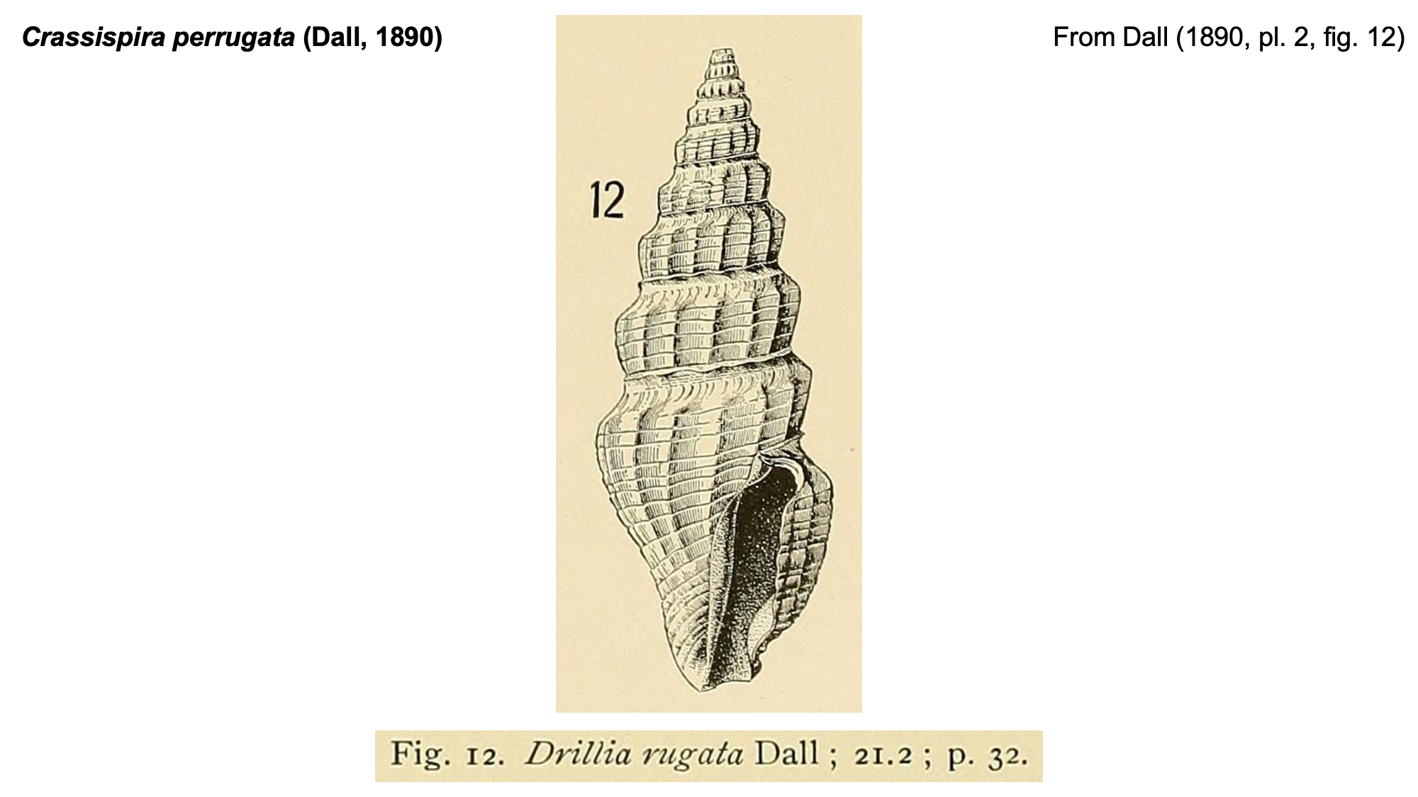 Other Combinations: Drillia abundans perrugata Dall, 1890 Hindsiclava perrugata (Dall, 1890) Clathrodrillia perrugata (Dall, 1890) Crassispira perrugata (Dall, 1890) (Accepted name)