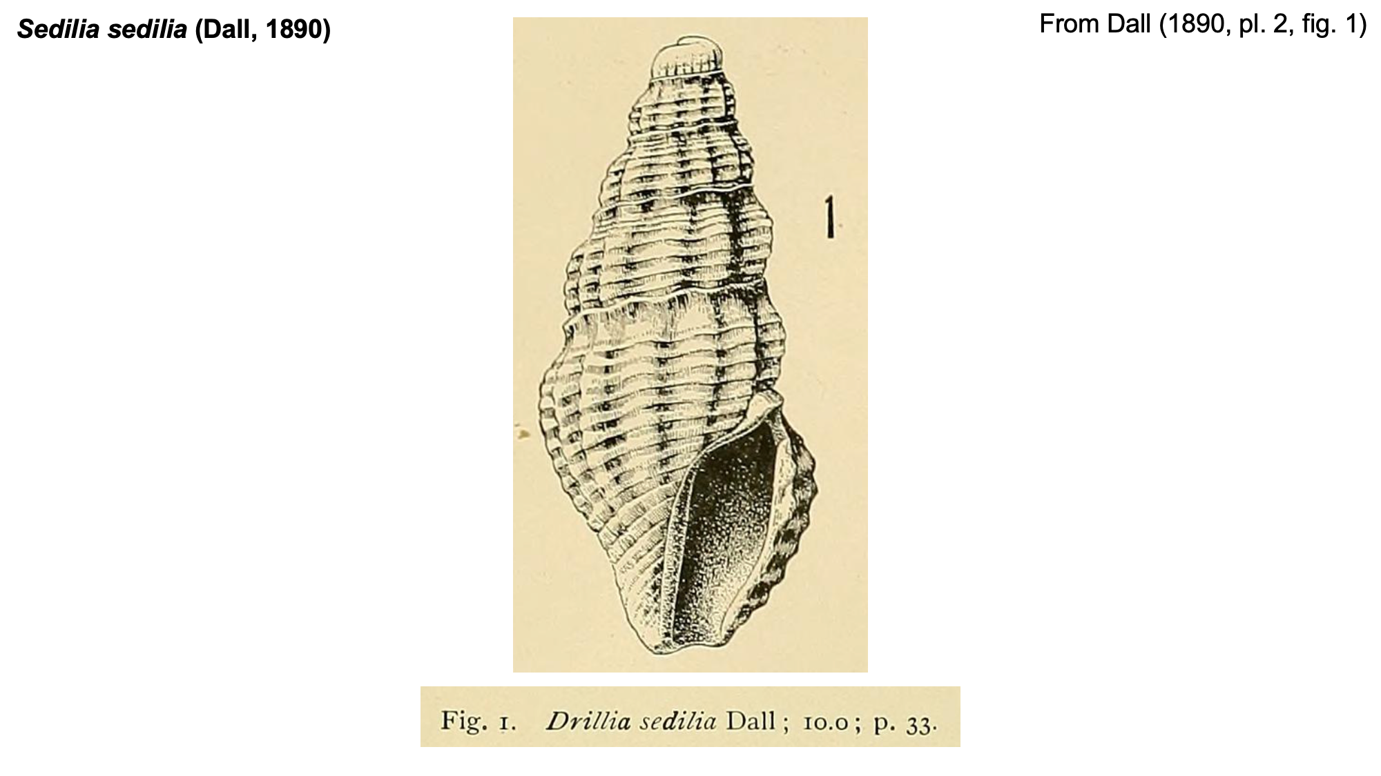 Other Combinations: Drillia sedilia Dall, 1890 Sedilia sedilia (Dall, 1890) (Accepted name)